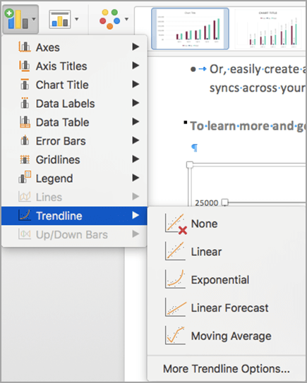 In the chart, choose the data series to add a trendline to, and then select the Chart Design tab.Â