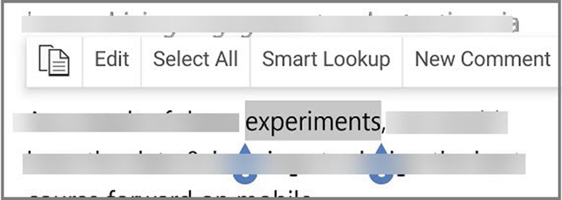 Or, to look up a phrase, tap once on a word, tap Select from the menu that appears, and then drag the selection to include the phrase you want, and then tap Smart Lookup. -