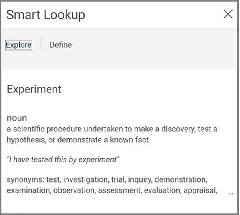 The Smart Lookup pane opens with more information about that word or phrase, including definitions, Wikipedia articles, and top related searches from the web. If you're a first time user a message opens saying that the output is powered by Bing.