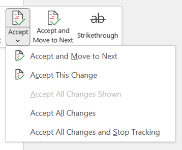Select Accept or Reject. The next sequential tracked change is highlighted for your review and action.