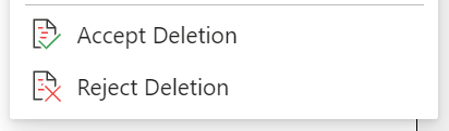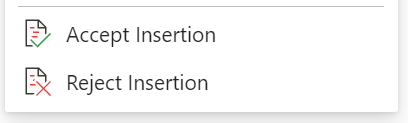 Working within a document, you can right-click on a tracked change to accept or reject the change. Using the right-click method displays a banner menu option and a drop-down menu option.