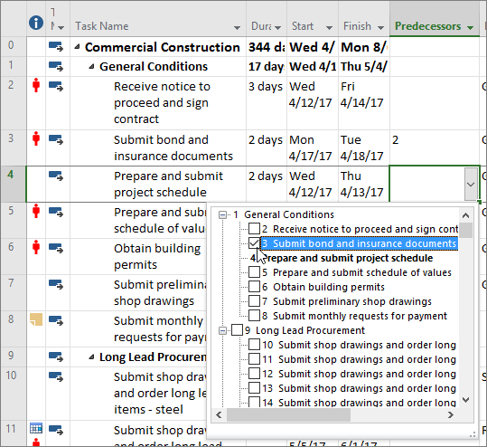 You can also select tasks from the same kind of drop-down in the Successors column. For more details, see Link tasks in a project.
