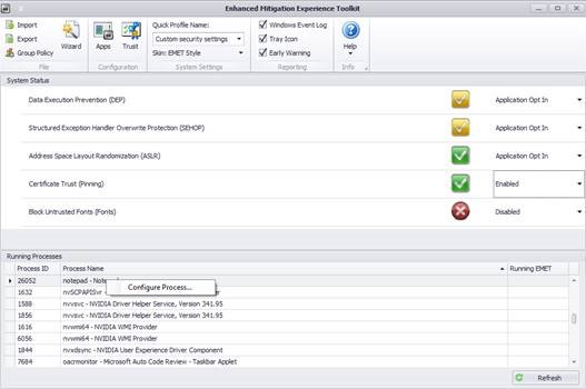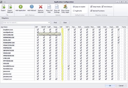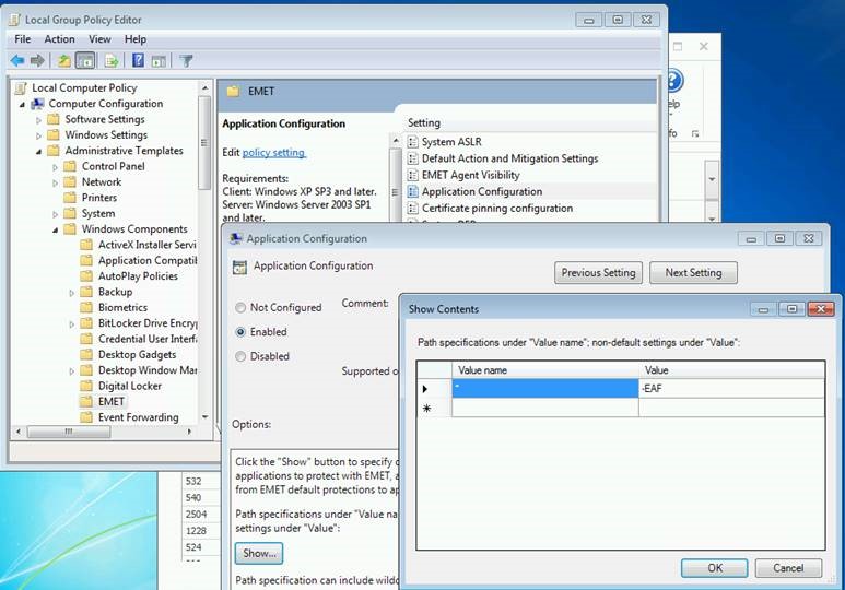 • Known issue 2 Symptoms Assume that you are running Enhanced Mitigation Experience Toolkit (EMET) on Windows 7 Service Pack 1 (SP1) on a computer on which update 3175024 is installed. When you try to start an application, the application freezes very early in the process and does not completely start. Cause This issue occurs because the Export Address table Filtering (EAF) mitigation is active on the application. Workaround To work around this issue, use one of the following methods to disable the EAF mitigation on all applications. Method 1 Select a running process in EMET, press and hold (or right-click) Configure Process, and then clear the EAF check box on each running application. The following screen shots show these steps. Method 2 In Group Policy, add an Application Configuration Group Policy setting that disables EAF for all processes by using an asterisk (*) as a wildcard character for the value name. Status