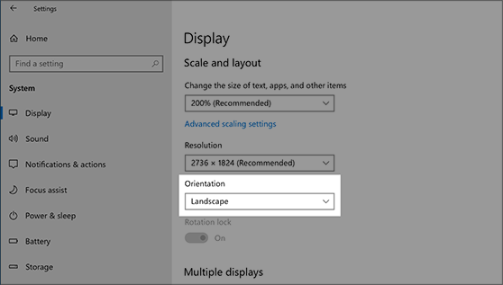 Select Start  > Settings  > System > Display, and choose a screen orientation from the drop-down list labelled Orientation.