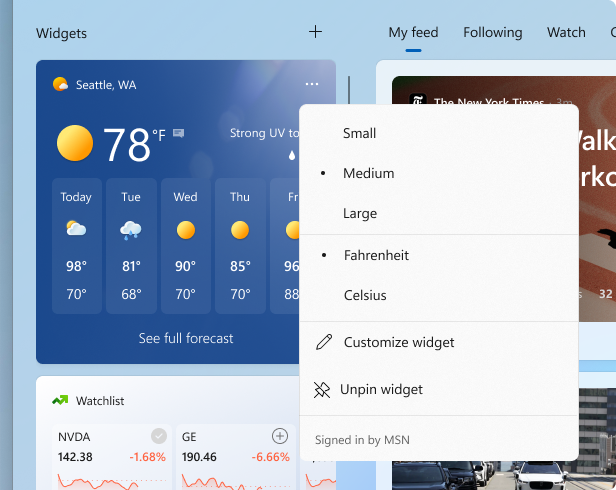 Signing in to Windows and Widgets with the same Microsoft account helps ensure that your news feed personalization is available across Widgets, apps, and devices.